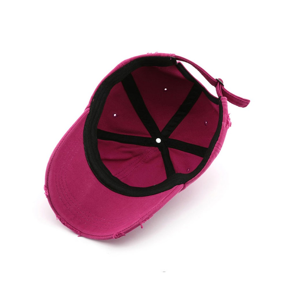 This baseball cap features a distressed, ripped design, creating a naturally worn-in effect and a strong vintage street style that showcases individuality and attitude. The overall design is understated yet layered, easily adding a trendy element to everyday outfits. The cap is soft and comfortable, conforming to the head's curves for a relaxed and pressure-free fit, suitable for extended wear. The classic front brim design combines style and practicality, effectively blocking sunlight while flattering facial proportions. The adjustable strap at the back allows for easy adjustment to different head sizes, ensuring a secure and comfortable fit that won't slip, meeting various wearing needs.