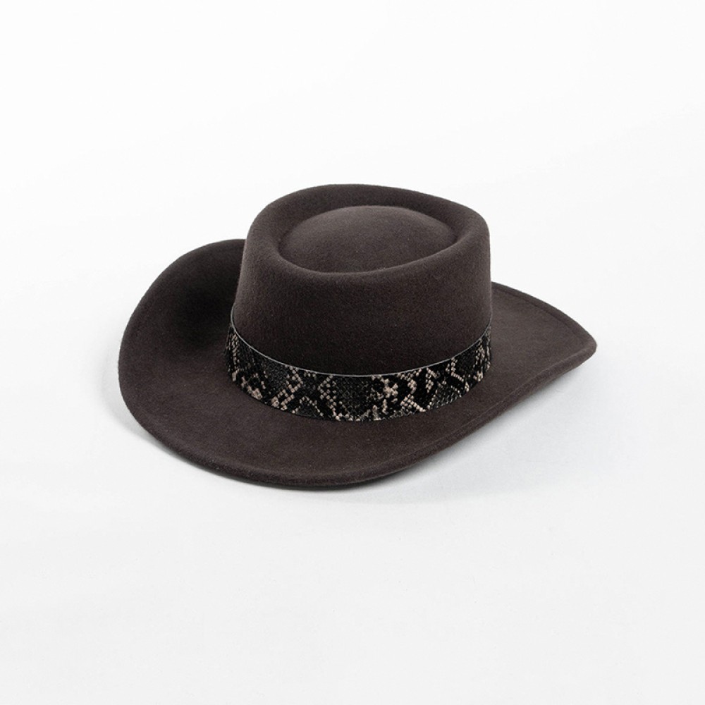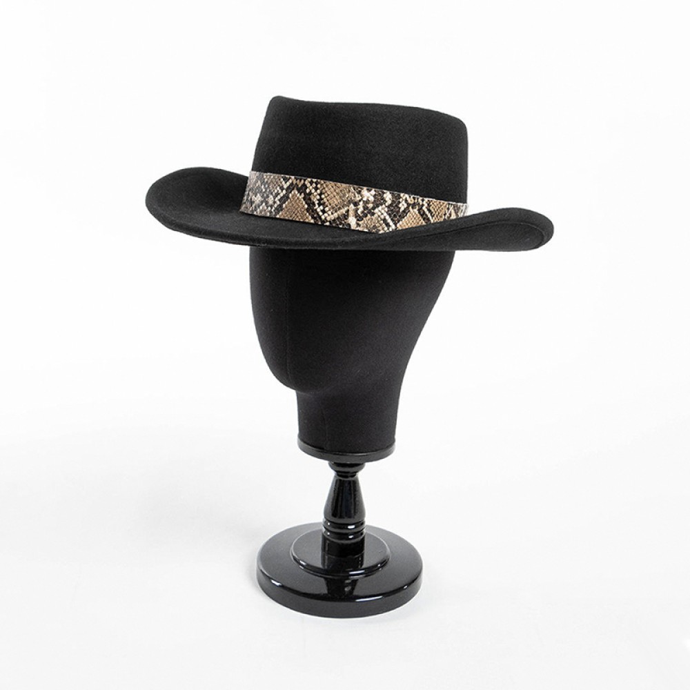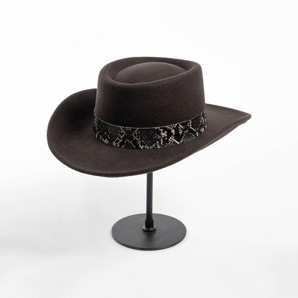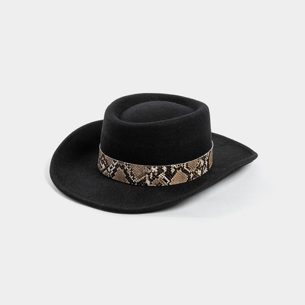 This fedora hat is based on a classic flat-top design, resulting in a sophisticated yet stylish look. The wide brim adds depth to the hat's silhouette and provides slight sun protection. The hat body features snake-print detailing, injecting unique personality into the simple design and giving it a modern and fashionable edge. The soft material ensures a comfortable and snug fit, making it easy to wear for everyday outings or casual occasions. It's a versatile piece that combines practicality and style.